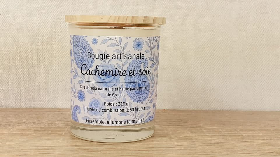Offrez-vous un instant de douceur et de raffinement avec Cachemire & Soie, une bougie artisanale coulée à la main dans notre atelier en Occitanie